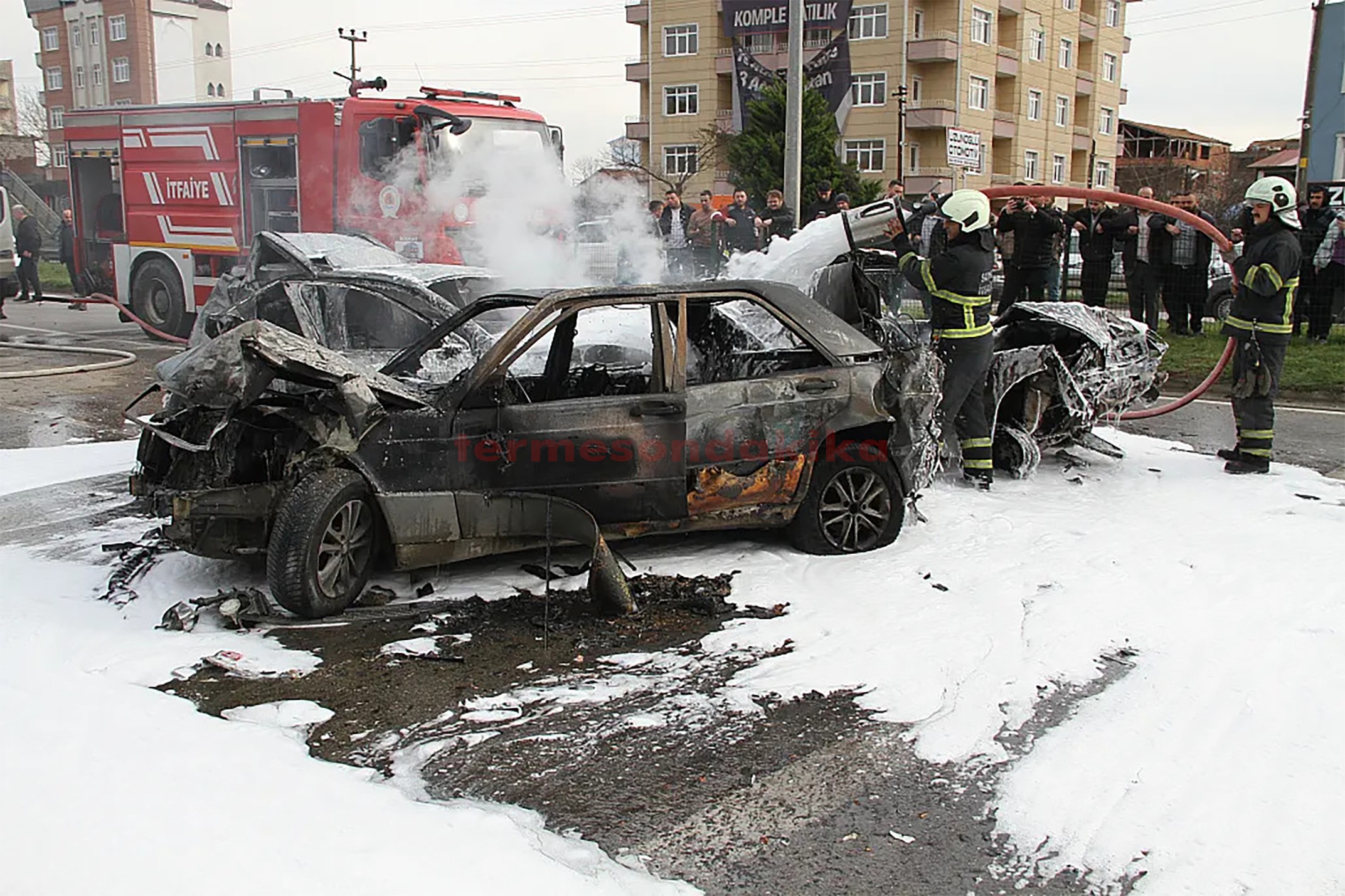 Kaza sonrası 3 otomobilde çıkan yangın, itfaiye ekiplerinin müdahalesiyle kontrol altına alınarak söndürüldü. Yangın soğutma çalışmalarının ardından araçların kullanılamaz hale geldiği görüldü.